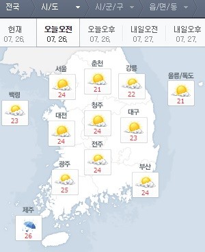 오늘 오전 서울은 24도, 춘천 21도, 대전 24도, 청주 24도, 대구 23도, 광주 25도, 부산 24도, 제주 26도를 기록 중이다.
