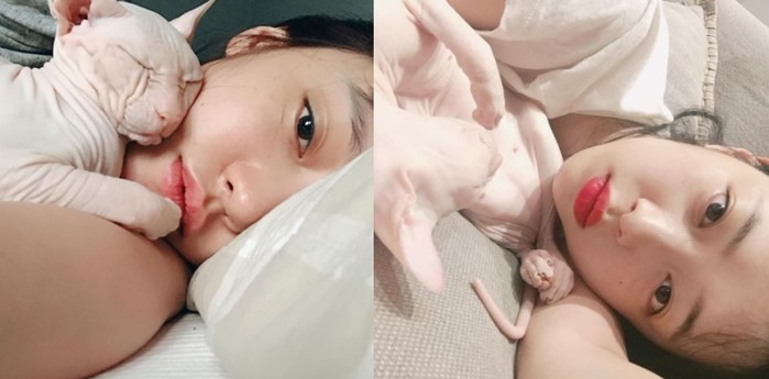 사진 속 구하라는 화장기 없는 민낯임에도 청순한 매력을 발산하고 있으며 특히 최근 온라인을 뜨겁게 달군 설리의 고양이가 그의 얼굴위에 누워있어 더욱 이목을 집중시켰다.