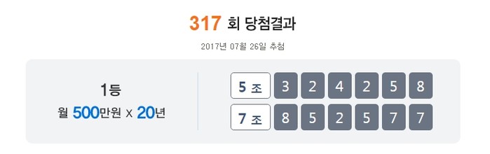 연금복권520 317회차 1등 당첨번호가 ‘7조852577’·‘5조324258’라고 공개되면서 금액에 대해 관심이 쏠린다.
