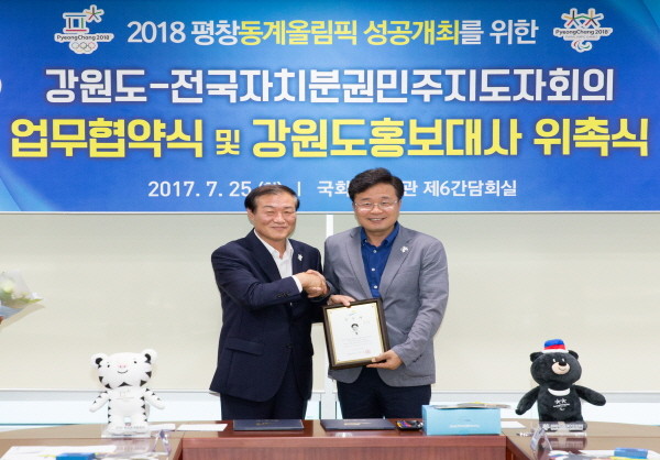지난 25일 김우영 은평구청장이 ‘2018 평창동계올림픽 강원도 홍보대사’로 선정돼 오는 2019년 7월24일까지 강원도 홍보대사로 활동하게 된다. 사진은 위촉식에서 김 구청장(오른쪽)이 위촉장을 받고 기념촬영 하고 있는 모습.(사진제공=은평구청)