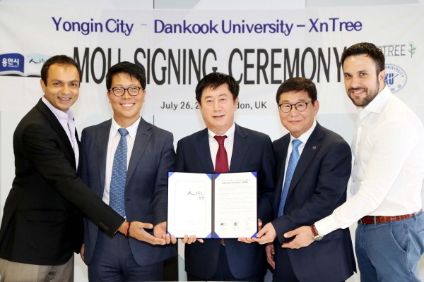 정찬민 경기 용인시장이 26일(현지시각) 영국 런던에서 영국의 스타트업 육성기업인 ‘엑센트리(XNTree)’와 ‘청년 스타트업 육성지원을 위한 업무협약’을 체결했다. 사진은 정 시장(가운데)과 관계자들이 기념촬영을 하는 모습.(사진제공=용인시청)