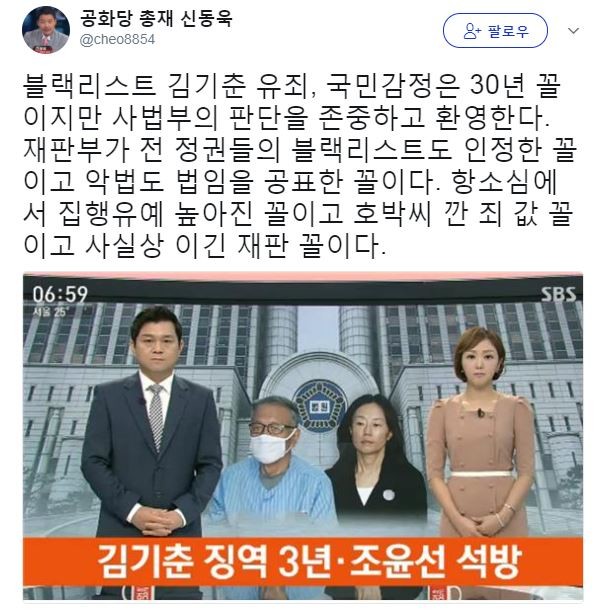 이에 공화당 신동욱 총재는 28일 자신의 트위터에 "블랙리스트 김기춘 유죄, 국민감정은 30년 꼴이지만 사법부의 판단을 존중하고 환영한다. 재판부가 전 정권들의 블랙리스트도 인정한 꼴이고 악법도 법임을 공표한 꼴이다. 항소심에서 집행유예 높아진 꼴이고 호박씨 깐 죄 값 꼴이고 사실상 이긴 재판 꼴이다"라는 글을 게재해 이목을 집중시켰다.