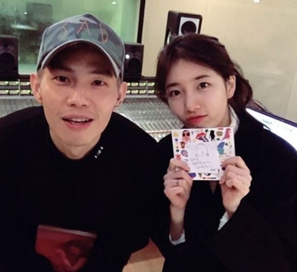 공개된 사진 속에는 박원과 수지가 어깨를 나란히 한 채 카메라를 응시하고 있으며 수지가 박원의 앨범을 들고 있어 눈길을 끌었다.