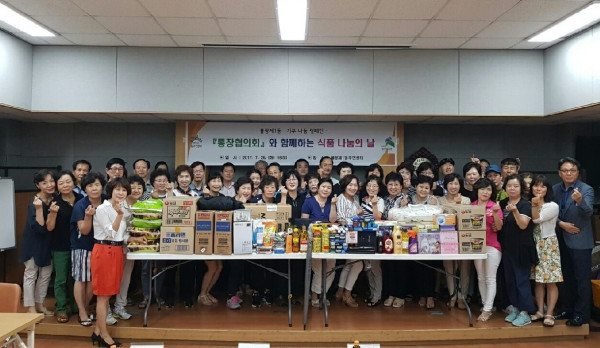 최근 은평구 불광제1동 주민센터는 지역사회보장협의체, 방위협의회, 주민자치위원회, 통장협의회 등의 직능단체와 함께 하는 ‘식품나눔의 날’ 행사를 개최했다. 사진은 통장협의회 관계자들이 기념촬영을 하고 있는 모습.(사진제공=은평구청)