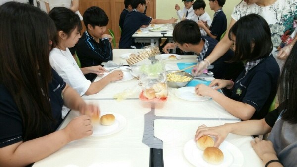 금천구는 최근 한울중학교에서 1학년 220여명 전체를 대상으로 ‘사회적경제와 바른 식생활’ 교육을 실시했다. 사진은 한울중학교 학생들이 ‘사회적경제와 바른 식생활’ 실습을 하는 모습.(사진제공=금천구청)