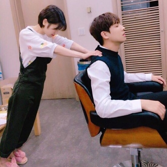 사진 속에는 의자에 앉아있는 이준과 뒤에서 그의 어깨를 마사지하고 있는 정소민의 모습이 담겨있다.