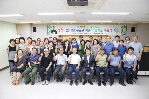 서울 구로구가 지난 28일 구청 평생학습관에서 약초의 역사, 구별, 채취방법, 효능 등의 내용으로 진행된 ‘허준 약초학교’의 수료식을 개최했다. 사진은 교육과정 70% 이상을 이수한 38명이 이성 구청장(앞줄 오른쪽에서 네 번째)과 함께 기념촬영을 하는 모습.(사진제공=구로구청)