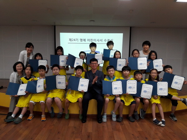 경기 용인시는 처인구 역북동 중앙도서관에서 최근 ‘어린이 사서체험프로그램’을 운영하고 이를 수료한 20명을 '명예 어린이사서'로 임명했다. 사진은 수료식 후 기념촬영을 하고 있는 어린이들의 모습.(사진제공=용인시청)