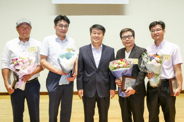 인천 계양구는 1일 구청 대강당에서 직원 400여명이 참석한 가운데 8월 직원 월례조회를 개최했다. 조회는 모범 선행구민 표창, 구청장 훈시 등의 순으로 진행됐다. 사진은 박형우 구청장(가운데)과 모범구민들이 기념촬영을 하는 모습.(사진제공=계양구청)