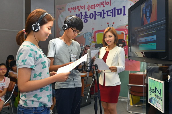 서울 송파구가 여름방학을 맞아 최근 뉴스 제작과 애니메이션 더빙 등의 체험을 해볼 수 있는 '송파 어린이 방송아카데미'를 실시했다. 사진은 애니메이션 더빙 수업에 참가한 어린이들이 더빙을 하고 있는 모습.(사진제공=송파구청)