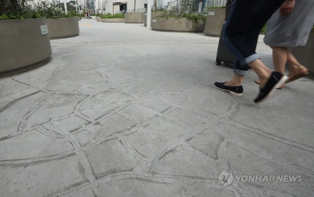 1일 오전 서울로 7017의 보행로에 콘크리트 균열 보강공사의 흔적이 거미줄처럼 얽힌 모습으로 선명하게 드러나 있다. 서울시는 지난달 서울로 7017 바닥에 균열이 발생한 80여 곳에 대해 보강공사를 벌였다.