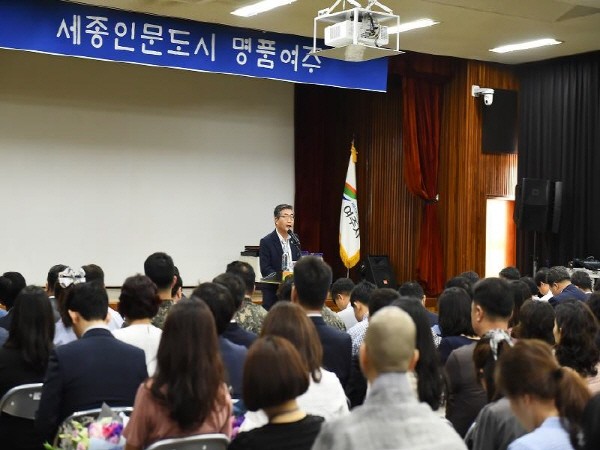 경기 여주시가 지난 1일 시청 대회의실에서 200여명의 공직자들과 함께 ‘8월 월례조회’를 개최했다. 사진은 원경희 시장이 인사말을 통해 장마철 안전에 대한 대비와 피해발생에 대한 신속한 대응 등 당면업무에 최선을 다해달라고 말하는 모습.(사진제공=여주시청)