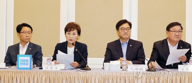 김현미 국토교통부 장관이 2일 오전 국회에서 열린 주택시장 안정화 방안 당정협의에서 발언하고 있다. 왼쪽부터 조정식 국회 국토교통위원장, 김 장관, 더불어민주당 우원식 원내대표, 김태년 정책위의장.