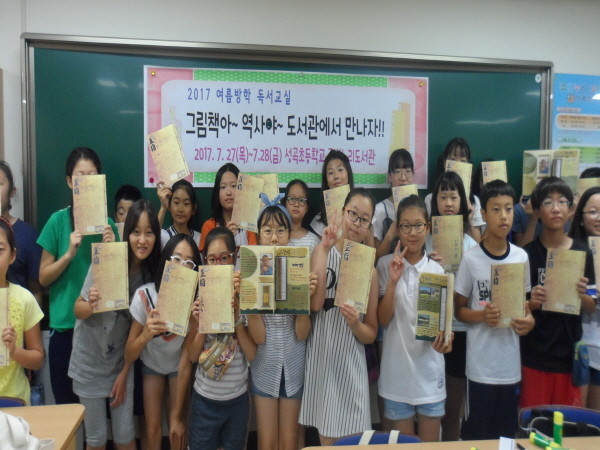 경기 부천시 성곡초등학교에서는 최근 여름방학을 맞아 '그림책아~ 역사야~ 도서관에서 만나자!'라는 주제로 '여름방학 독서교실'을 실시했다. 사진은 학생들이 책을 들고 기념촬영을 하는 모습.(사진제공=부천교육지원청)