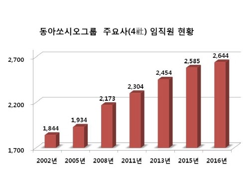 동아쏘시오홀딩스는 1959년 공채 1기를 시작으로 지난해까지 110기를 채용했다. 현재 동아쏘시오홀딩스를 비롯한 동아제약, 동아에스티, 디엠바이오 주요 사업회사의 임직원 수는 2002년 1844명에서 2016년 2644명까지 43.4% 증가했다. 동아쏘시오그룹 전체로는 약 5000여명의 임직원이 근무하고 있다.
