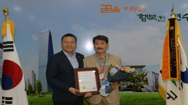 이재호 인천 연수구청장은 8일 구청 소회의실에서 복지, 문화·체육 분야의 '일일 명예구청장'으로 선발된 지역주민 심상우씨(60)에게 위촉장을 전달했다. 사진은 이 구청장(왼쪽)이 심씨와 기념촬영을 하는 모습.(사진제공=연수구청)