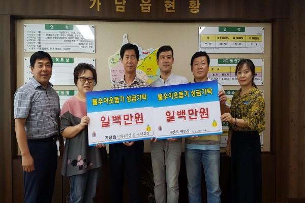 경기 여주시 가남읍 신해4리 이장 및 부녀회장과 지역내 소재한 오렌지팩토리는 지난 7일 읍사무소를 방문해 이웃돕기 성금으로 총 200만원을 전달했다. 사진은 관계자들이 성금을 전달한 후 기념촬영을 하는 모습.(사진제공=여주시청)