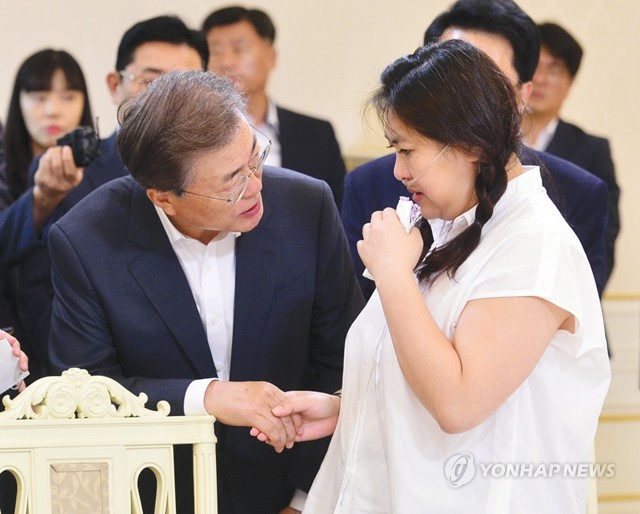 문재인 대통령이 8일 오후 청와대 인왕실에서 열린 가습기 살균제 피해자와의 면담에서 울먹이는 피해자 조순미 씨의 손을 잡고 위로하고 있다.