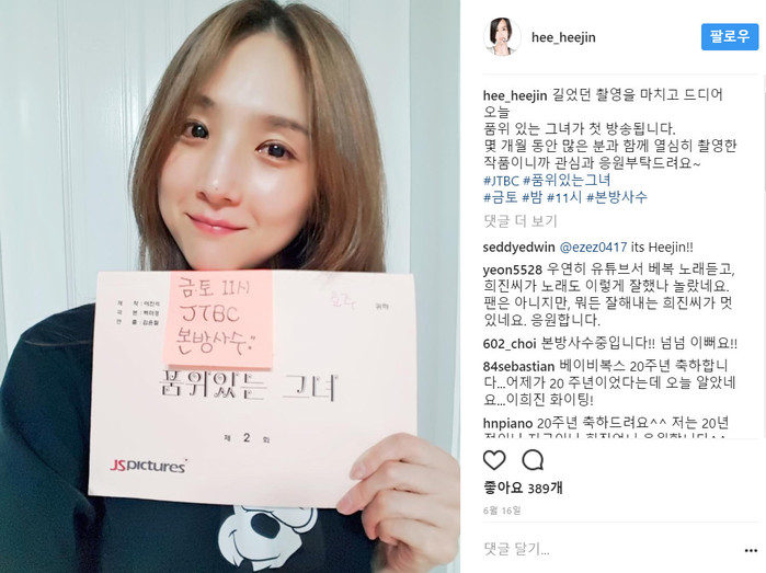 이희진은 ‘길었던 촬영을 마치고 드디어 오늘 품위 있는 그녀가 첫 방송됩니다. 몇 개월 동안 많은 분과 함께 열심히 촬영한 작품이니까 관심과 응원 부탁드려요‘라는 코멘트를 함께 올려 ’품위 있는 그녀‘가 첫 방송 되는 날 본방 사수를 독려했다.