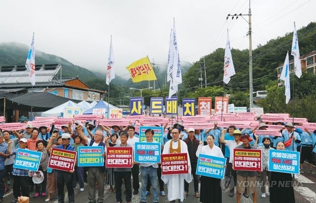 성주 사드 기지 소규모 환경영향평가 현장확인이 예정된 10일 오전 경북 성주군 초전면 소성리 마을회관 앞에서 사드배치철회 성주투쟁위원회 등 시민단체 관계자들이 정부의 전자파 측정 등에 반대하는 기자회견을 하고 있다.