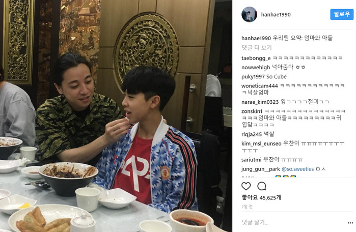 지난 5일 한해는 자신의 SNS에 "우리팀 요약: 엄마와 아들"이라는 글과 함께 한 장의 사진을 게재했다.