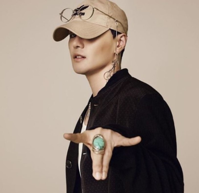 사진속 딘은 블랙컬러 점퍼에 블랙이너를 입고 라이트브라운 캡위에 안경을 얹고 눈을 반쯤 가린채 옆모습으로 카메라를 바라보고 있다.