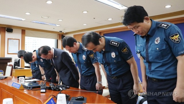 김부겸 행정안전부 장관(왼쪽 세번째)과 경찰 지휘부가 13일 오후 경찰청에서 열린 경찰 지휘부 회의에서 SNS 게시글 삭제지시 의혹과 관련, 국민에게 사과하고 있다.