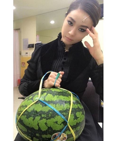 게재된 사진 속 옥주현은 올블랙 의상을 입고 강한 뮤지컬 분장을 한 채 카리스마를 뽐내고 있으며 그의 무릎 위에 수박이 올려져있어 보는 이들의 웃음을 자아냈다.
