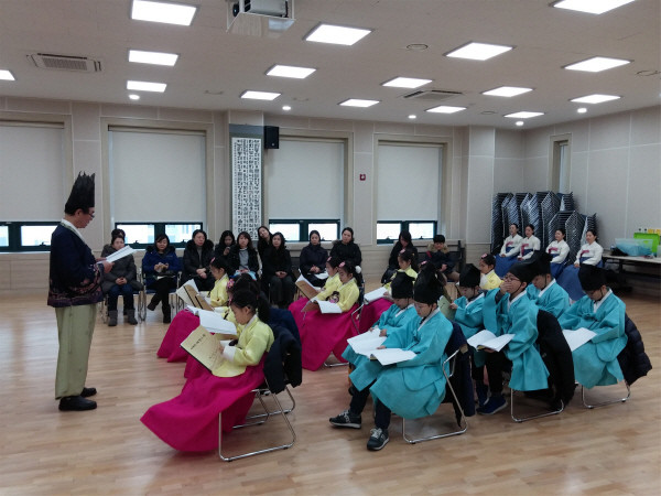 지난 11일 서초구가 초등학생들을 대상으로 실시한 ‘훈장님과 함께하는 사자소학&예절교실’ 종강식이 잠원동주민센터에서 개최됐다. 사진은 프로그램에 참가한 어린이들이 사자소학을 낭독하고 있는 모습.(사진제공=서초구청)