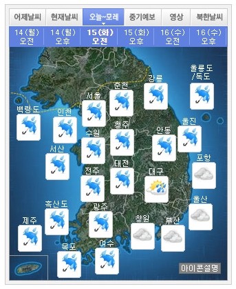 기상청에 따르면 15일 서해상에 위치한 저기압 영향으로, 전국에 흐리고 비가 오는 날씨가 이어질 것으로 전망이며 또한 이번 주 저기압이 오랫동안 영향을 주면서 전국에 강수 지속 시간이 길 것으로 예상된다.