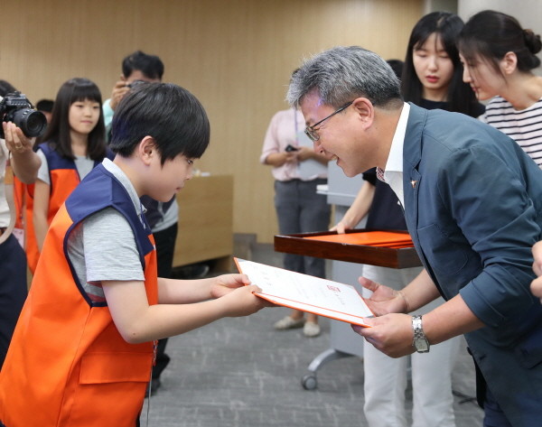 경기 화성시가 지난 10일 모두누림센터에서 ‘2017년 제1회 아동의회 발대식 및 임시회의’를 개최했다. 사진은 채인석 시장(오른쪽)이 한 아동에게 위촉장을 수여하고 있는 모습.(사진제공=화성시청)