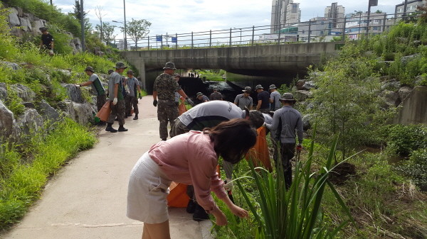 경기 용인시 수지구 상현1동은 14일 광교 원천리천 일대에서 지역주민과 육군 제7673부대 장병 등이 참석한 가운데 환경정화활동을 실시했다. 사진은 환경정화활동에 참여한 관계자들이 개천변에서 환경정화를 하는 모습.(사진제공=용인시청)