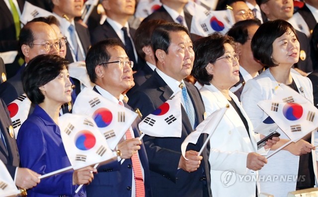 여야 5당 대표가 15일 오전 세종문화회관에서 열린 제72주년 광복절 경축식에서 광복절 노래를 부르고 있다. 왼쪽부터 더불어민주당 추미애 대표, 자유한국당 홍준표 대표, 국민의당 박주선 비상대책위원장, 바른정당 이혜훈 대표, 정의당 이정미 대표.