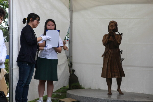 금천구가 72주년 광복절을 맞아 지난 15일 오후 5시 금천구청 앞 광장에서 ‘금천 평화의 소녀상’ 제막식을 개최했다. 사진은 금천구 청소년 마을정부 총리 오경선 학생이 제막식에서 헌시를 낭독하고 있는 모습.(사진제공=금천구청)