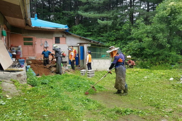 경기 양평군 의용소방대 남녀연합회 회원 20여명은 지난 7~13일 일주일에 걸쳐 옥천면과 단월면에 거주하는 수급자 3가구의 집수리 봉사를 성공적으로 마쳤다. 사진은 참여자들이 단월면 석산리에 거주하는 홀몸노인 집 주변 제초작업을 하는 모습.(사진제공=양평군청)