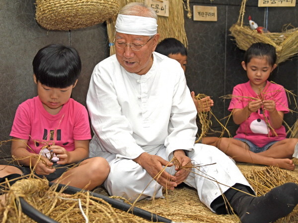 광진구 중곡4동주민센터에서는 지난 16일 주민 중심 세대 간 공감 소통을 위해 ‘전통생활문화 체험장’을 열었다. 사진은 생활한복을 입은 노인이 어린이들에게 지푸라기로 새끼줄을 꼬아 전통생활용품을 만드는 방법을 가르쳐 주는 모습.(사진제공=광진구청)
