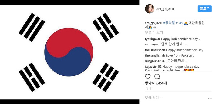 광복절이었던 지난 15일 고아라는 자신의 인스타그램에 "#광복절 #815"라는 해시태그와 함께 "대한독립만세"라는 글을 게재했다.