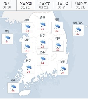 오전 서울은 23도, 춘천 21도, 대전 23도, 대구 22도, 부산 24도, 광주 24도, 제주 25도를 기록 중이다.