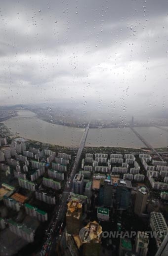 전국 대부분 지역에 비가 내리는 20일 오후 서울 도심 위로 비구름이 지나가고 있다