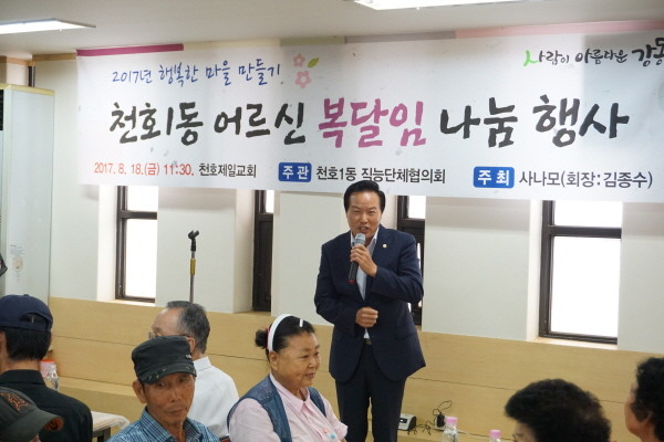 이날 행사에서는 노인들의 여름철 기력회복을 위해 천호1동 직능단체협의회가 200인분의 삼계탕을 준비해 제공했다.