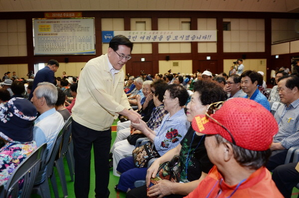 동대문구는 지난 18일 오전 11시30분 구청 다목적강당에서 대한노인회 동대문구지회 주최로 ‘제6회 경로효행 장학금 전달식’을 개최했다. 사진은 행사에 참석한 유덕열 구청장이 노인들과 인사를 나누는 모습.(사진제공=동대문구청)
