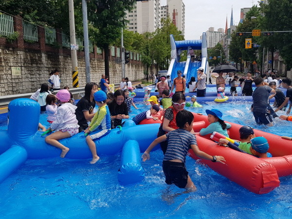 경기 수원시 영통구 영통1동에서는 지난 20일 ‘영통 차 없는 거리 추진단’ 주관으로 황곡초교삼거리에서 황골공원 입구까지 차량을 통제하는 ‘자동차 없는 날(Car Free Day)’ 행사가 열렸다. 사진은 도로에 설치된 대형 수영장에서 어린이들이 물놀이를 즐기는 모습.(사진제공=영통구청)