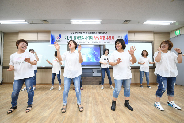 경기 오산시는 지난 18일 오산대학교 평생교육원 교육실에서 수료생 20명과 곽상욱 시장, 정영선 오산대학교 총장 등이 참석한 가운데 ‘실버코디네이터양성과정’ 수료식을 진행했다. 사진은 수료식에서 교육생들이 공연을 펼치는 모습.(사진제공=오산시청)