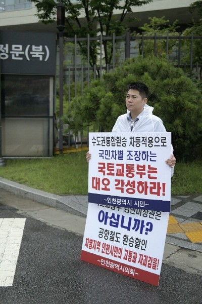 [인천=문찬식 기자] 인천시의회 산업경제위원회 김정헌 위원장은 최근 세종시 정부종합청사 앞에서 공항철도요금기준 일원화 권리를 되찾기 위한 1인 시위 의정 활동을 펼쳤다.