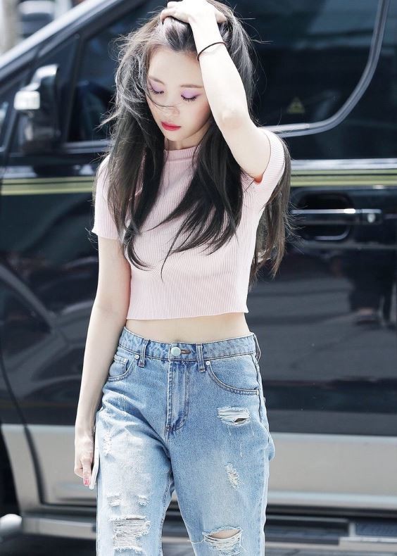 사진 속 선미는 분홍색 크롭티에 라이트블루 컬러의 디스트로이트진을 입고