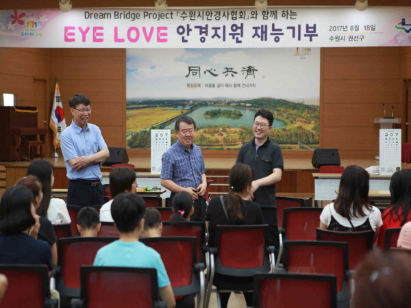 경기 수원시 권선구는 최근 수원시안경사협회와 저소득 청소년들의 눈 건강관리를 위한 'EYE LOVE 안경지원' 재능기부 사업을 추진했다. 사진은 이필근 구청장(가운데) 및 관계자들이 청소년들과 이야기를 나누는 모습.(사진제공=권선구청)