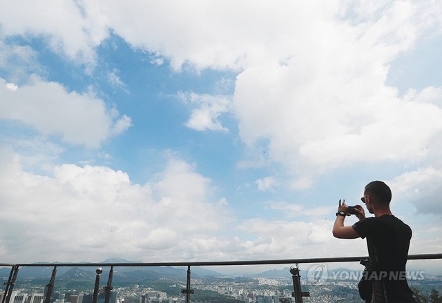 더위가 물러간다는 처서를 하루 앞둔 22일 오전 서울 남산공원 전망대에서 관광객들이 기념촬영을 하고 있다.