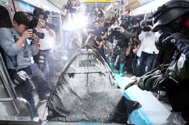 22일 오후 서울 사당역에서 관계자들이 지하철 테러대응 훈련을 하고 있다.