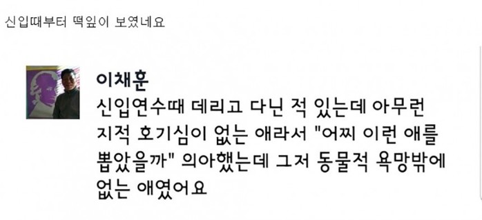 이채훈PD는 자신의 SNS에 "신입연수 때 데리고 다닌 적 있는데 지적 호기심이 없는 애라서 '어찌 이런 애를 뽑았을까" 의아했는데 그저 동물적 욕망 밖에 없는 애였어요"