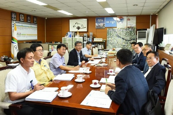 지난 22일 ‘여주 반려동물테마파크’ 사업을 공동 추진하는 KT스카이라이프 이남기 사장 일행이 원경희 여주시장을 찾아 사업의 적극적인 추진을 약속했다. 사진은 원 시장(왼쪽에서 네번째)이 실무진들과 함께 이야기를 나누고 있는 모습.(사진제공=여주시청)